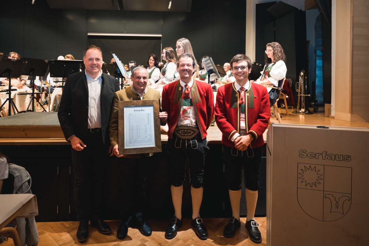 Am 07. Mai konnte die Musikkapelle Serfaus zahlreiche Konzertbesucher zum Frühjahrskonzert im Saal Via Claudia begrüßen. Das Konzert stand ganz im Zeichen des 800-jährigen Gemeindejubiläums, das bereits 2020 begangen wurde. Zu diesem Anlass ließ die Musikkapelle Serfaus das Werk „Centum Octo“ vom Fendler Musikschullehrer und Komponisten Stefan Köhle komponieren. Das Werk sorgte für Begeisterung im Publikum und auch Bürgermeister Paul Greiter, dem das Jubiläumsgeschenk in Form einer gerahmten Partitur übergeben wurde, war von der gelungenen Uraufführung sichtlich angetan.